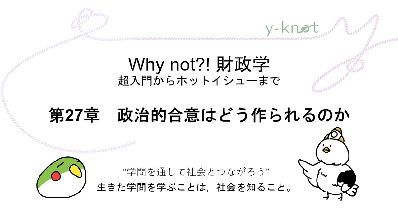 政治的な合意はどうつくられるのか Chapter structure 予習課題 ①国政政党(自民党など)の財政に関する公約がどれくらい実現できているかを調べてみよう。 ②友人や家族と「どのくらいの税率が望ましいか」というテーマで議論してみよう。意見が合わない場合はなぜ合わないか考えてみよう。 動画